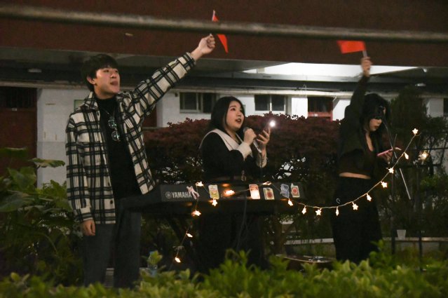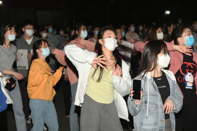这边广场舞跳的正嗨,一个由校学生会文体部举办的宿舍楼演唱会也正在燃情演唱,在19栋宿舍楼下,音乐舞蹈学院的“淦飯魜乐队”正在演唱《夜空中最亮的星》,演唱者蒋坤洁告诉记者:“这种氛围真的很好,大家挥舞手机,跟着我们一起唱,感觉找到了校园的活力和青春。”