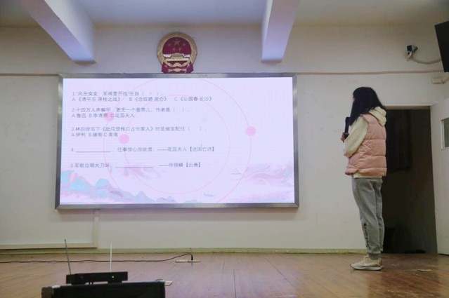 在主持人宣读完比赛规则后,本次比赛正式开始。一句“风云突变,军阀重开战”拉开了比赛的序幕,一号选手付雨萱对诗词的掌握让在场观众为之赞叹不已,为接下来比赛的同学做出了良好的表率。后续选手也不甘示弱,厚积薄发,赢得台下一阵又一阵的欢呼与掌声。到了中场游戏环节,同学们积极参与,毫不逊色于台上的诸位选手。