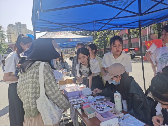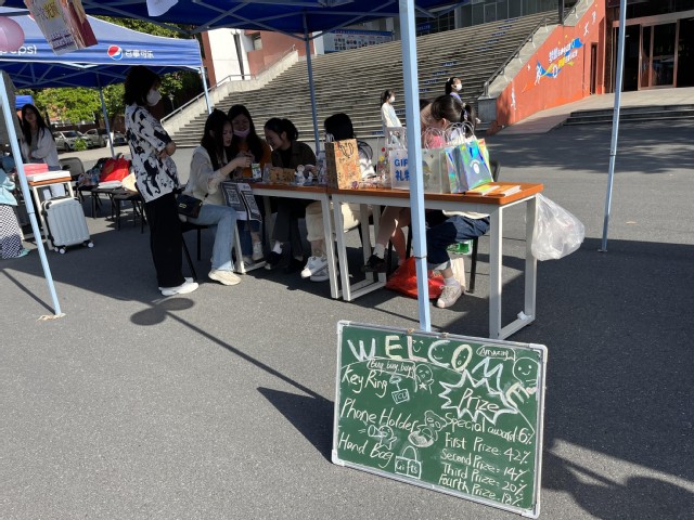 本次活动设置了饮食区、DIY区和百货区,其中包括怀旧小零食、石膏娃娃、套圈、DIY手机壳、生椰拿铁、鲜花、盲盒等产品。展会活动开始后,现场如火如荼,展品销售生意火爆,其中盲盒摊位脱颖而出,两个多小时便售罄。除此之外,英文交流集印章可兑换奖品的活动使顾客参与热情高涨,同学们纷纷用英语与顾客交流,尽情展示自己的外语风采。