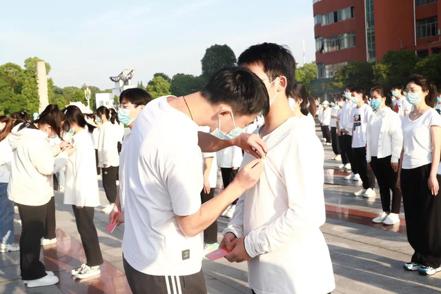 刘臻彧宣读新团员名单,老团员代表为新团员颁发团章并佩带团徽。