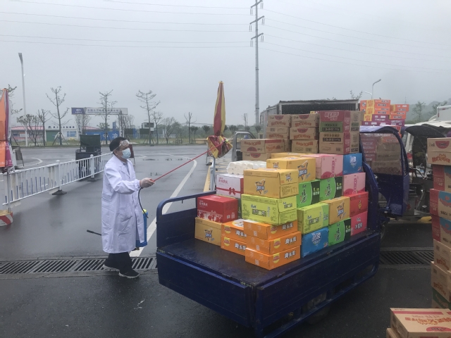 学校保卫处及时做好物资进入校园的消杀工作,工作人员全天值守,对每一个进入校园的货物运输车辆进行消毒,消毒完成后,再由车辆进行转运,确保校园安全。