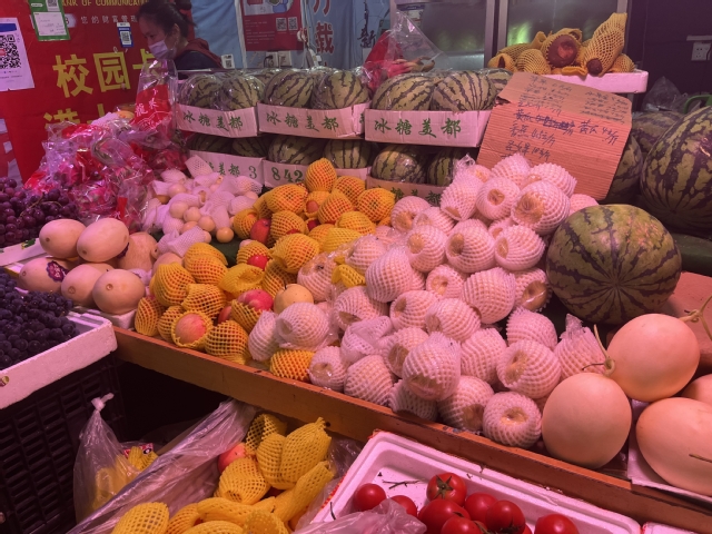 在校本部和北校区,校园超市货架上货物充足。同学们按照疫情防控要求,自由选择生活所需物品。学校资产处协调校内各商户,持续有效组织货源,合理有序投放,丰富商品种类,确保校园物资供应充足,全力保障师生需求。