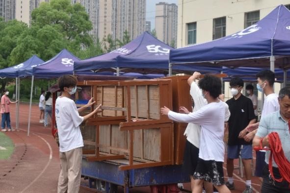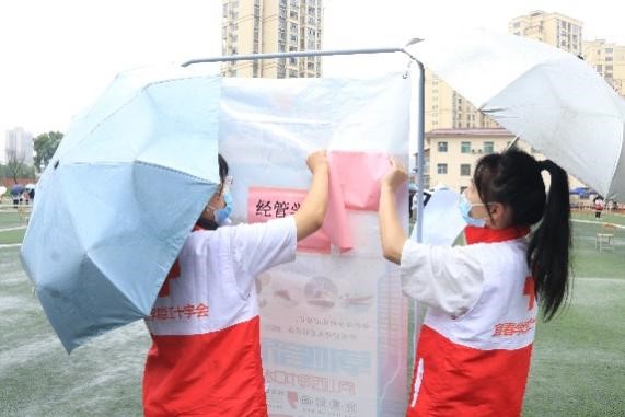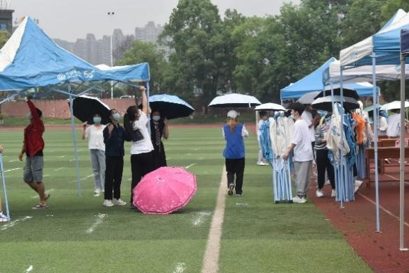 “得知疫情突发后,我们就组建好了‘抗疫’小队,以随时应对突发情况,收到核酸检测的通知后,我们迅速行动,召集了50名志愿者布置现场。”校红十字会负责人李小龙说。搬桌椅、搭帐篷、拉警戎线……志愿者们有条不紊地布置着现场,即使下着雨,也挡不住志愿者们的热情。