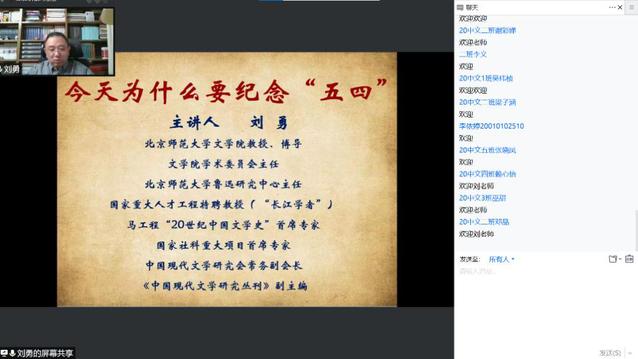 本站讯(文学与新闻传播学院 陈晓莲供稿)5月19日晚6点30,beat365官方网站文学与新闻传播学院通过腾讯会议,与相隔一千多公里身在北京的教育部“长江学者”特聘教授、北京师范大学文学院学术委员会主任、博士生导师刘勇教授连线互动。此次,刘教授带来了一堂以“今天我们为什么要纪念‘五四’”为主题的线上精彩学术专题讲座。讲座由beat365官网党委委员、副校长李建军主持,该院院长冷瑾、中文系主任刘旭东等人在线,该院两百多名大学生聆听了讲座。