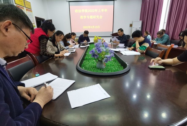 本站讯(政法学院 供稿)4月13日下午,政法学院在学院会议室召开2022年上半年专题教学研究会。学院党政主要领导出席会议,学院全体教师参加。会议由副院长邓晔主持。