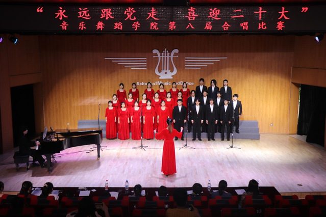 本站讯(学生记者 于鑫)为深入贯彻党的十九大精神和十九届历次全会精神,进一步传承红色基因,坚定跟党走的信念,深化实践教学改革,展示学生积极向上的精神风貌,6月1日下午,音乐舞蹈学院在艺术楼音乐厅召开“永远跟党走 喜迎二十大”第八届合唱比赛。该院领导及部分师生观看本次比赛,音乐学专业教师担任评委。