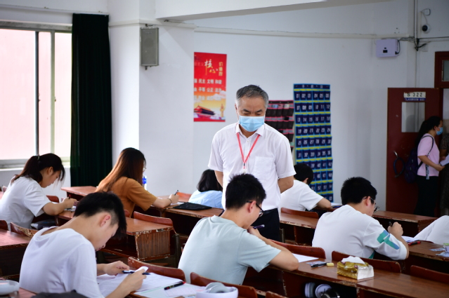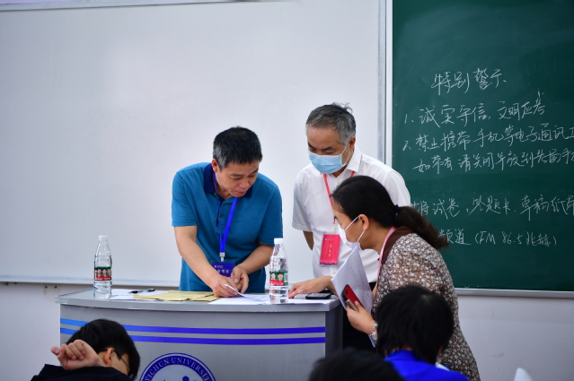 本站讯(记者 何杰)6月18日,校党委书记、校长曾晓春,校党委委员、副校长李建军携相关部门负责人,深入教学主楼、二教学楼考场,检查考试组织、考场秩序、教师监考等情况,现场指导期末考试工作。