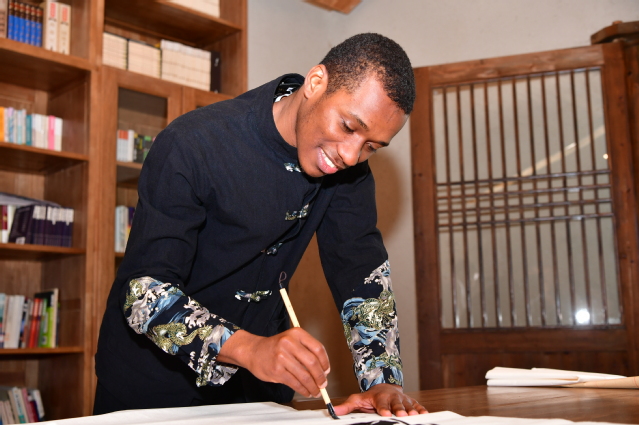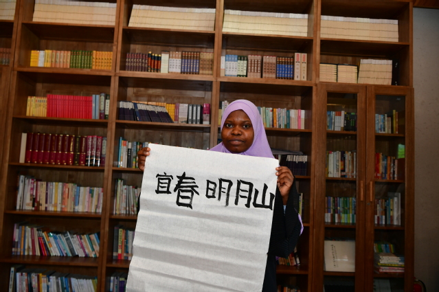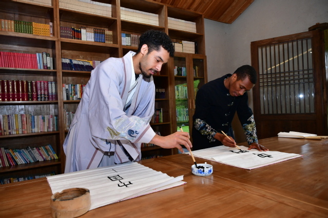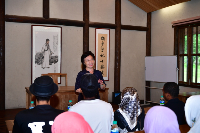 在郑谷草堂,原宜春市市委副书记、宜春市人大常委会主任、党组书记,宜春市关工委主任任桃英充满激情地为留学生讲授了一堂关于宜春历史文化和郑谷草堂知识的传统文化课。课堂上,任桃英还带领了留学生深情并茂地朗读了诗人郑谷的诗作。在书堂,留学生们挥毫,兴致勃勃地书写了毛笔字。
