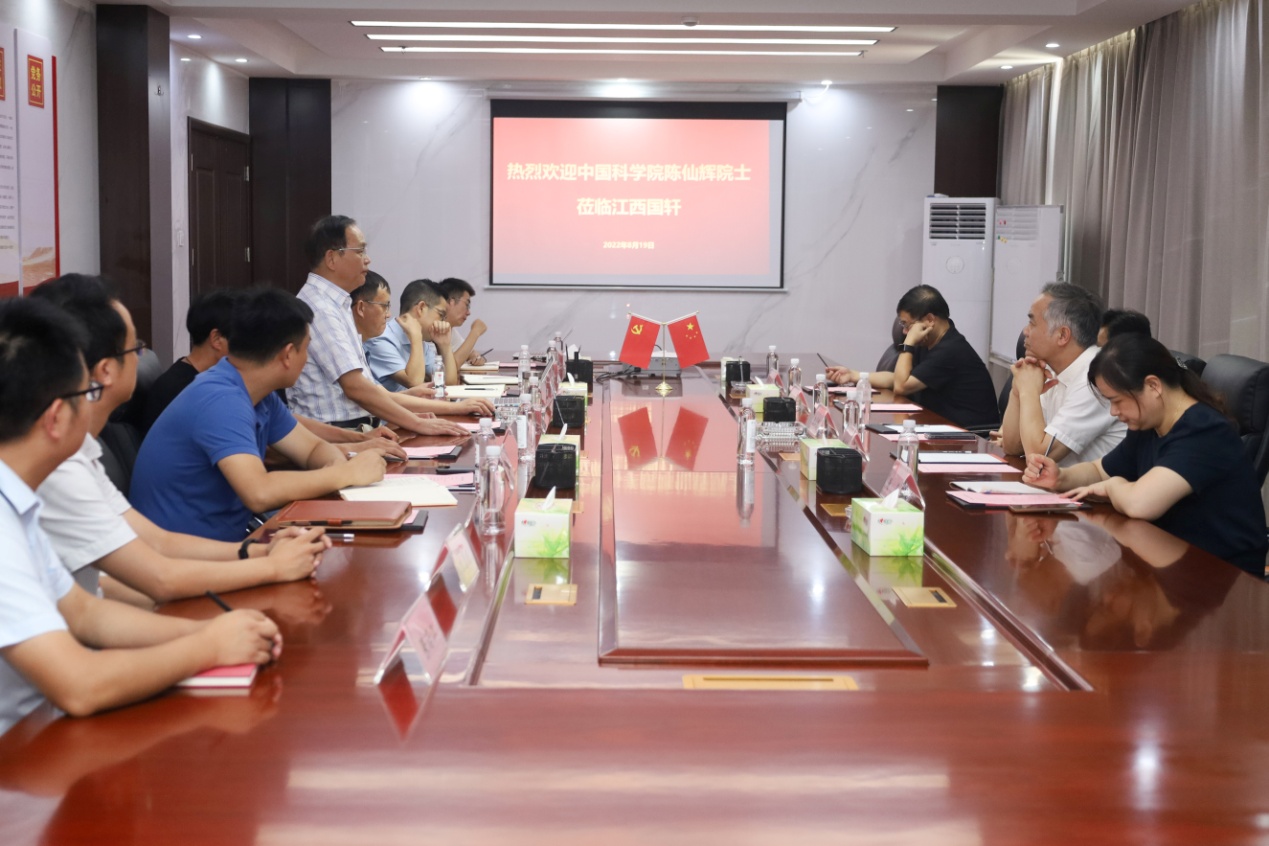 会上,陈仙辉院士听取江西国轩科技创新及产品应用等方面取得的发展成果,就研究院建设、科研项目合作和人才培养等方面进行现场指导。