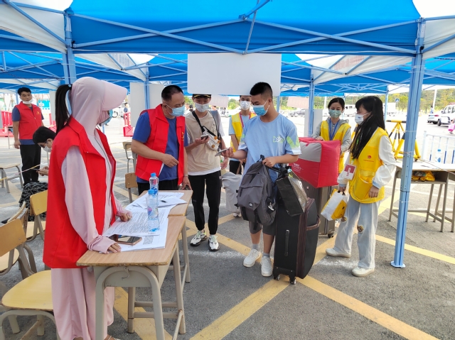 9月4日,迎新第一天,在校本部大门口疫情防控检查点,来自机关党总支的党员先锋队和迎新志愿者们一道查验新生“两码”。