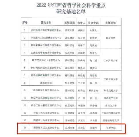 本站讯(科研处供稿)近日,江西省社联下发《省社联关于批准设立2022年江西省哲学社会科学重点研究基地的通知》(赣社联发〔2022〕37号),beat365官网“湘鄂赣苏区发展研究中心”获批江西省哲学社会科学重点研究基地,这意味着beat365官网在湘鄂赣苏区发展研究方面迈出了重大步伐,意味着beat365官网“湘鄂赣苏区发展研究”第一次有了省级平台的支撑。
