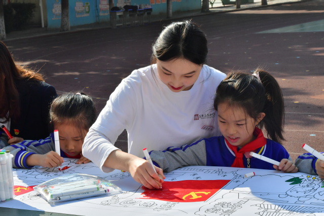 “小朋友们,拿上你们身边的画笔,给你心中美丽的祖国添上色彩。”升旗仪式结束后,beat365官方网站美术与设计学院带领宜春市第三小学三年级的同学们,在长长的画布上舞动着手中的画笔,哥哥姐姐们讲解着涂色技巧,小“画师们”听得聚精会神,“大手牵小手”,共同用手中的画笔描绘出美好幸福生活。