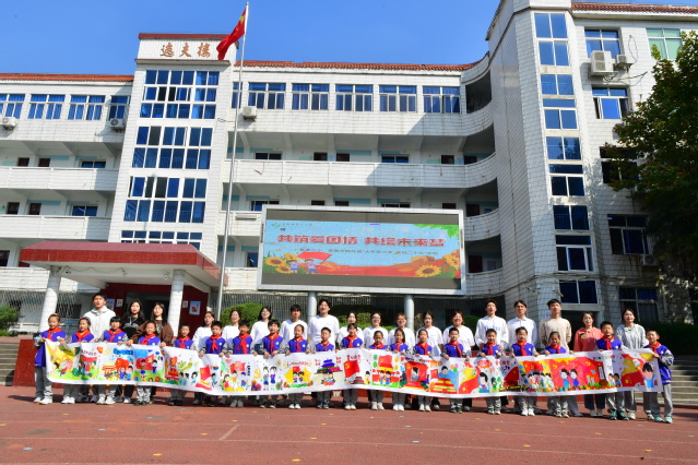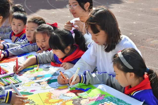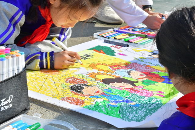 经过一个多小时的精心绘制,大家齐心协力完成了一幅“共绘未来梦”的十米绘画图卷,画中雄伟的天安门,鲜艳的五星红旗,壮丽的祖国河山……一幅色彩斑斓的画卷呈现在大家眼前。