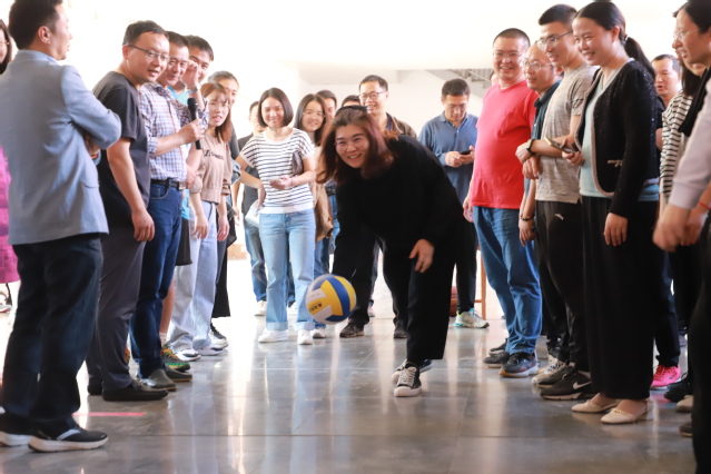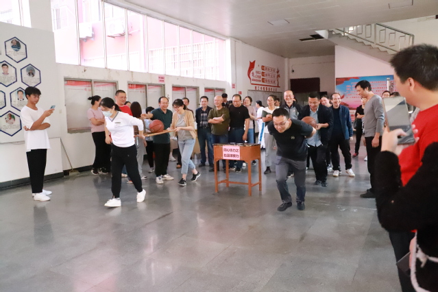 当天的活动分为四个部分,分别是学习强国之快问快答、勇毅前行之趣味保龄球、心有灵犀之你画我猜、同心协力之抬篮球接力。该院教职工齐聚理工楼,按系分为四个小组,采用积分制进行游戏,现场气氛热烈。老师们以极高的热情参与竞赛活动,默契配合,手脚并用,使出浑身解数为小组赢得积分,释放压力的同时也锻炼了身心。最后,根据裁判的统计积分为教职工们颁发奖品。