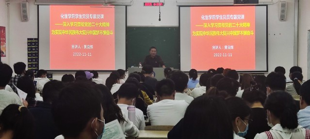 本站讯(学生通讯员 谢冰幸 刘小光)为教育引导广大学生党员深入学习领会党的二十大精神,进一步坚定理想信念,为实现中华民族伟大复兴中国梦而团结奋斗,11月11日晚,化学与生物工程学院在二教楼教室开展了一堂学生党员学习贯彻党的二十大精神专题党课。本次党课由该院党委书记黄良辉主讲,该院全体研究生和本科生党员100余人参加了本次党课学习。