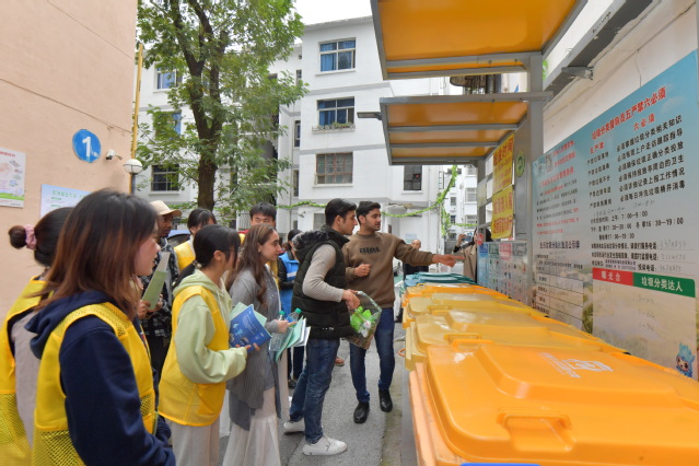 通过与社区居民讲解、发放“垃圾分类知识手册”等方式,学生们向居住在化成社区的居民普及垃圾分类常识,传递健康绿色生活理念。