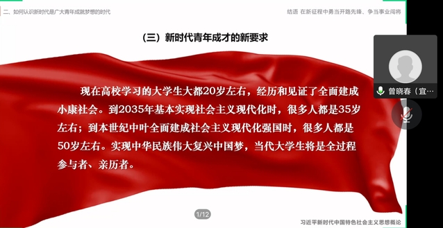 思政课围绕习近平总书记对大学生有什么样的殷切期望;如何认识新时代是广大青年成就梦想的时代;如何为实现中华民族伟大复兴接续奋斗三个部分展开。曾晓春运用丰富的案例、生动的图片、详实的数据,结合自身教育教学经验,图文并茂、深入浅出地为同学们进行了授课,进一步加深了学生对中国共产党的认识,厚植了学子爱党爱国爱社会主义情怀,坚定了学子听党话、跟党走,不负青春、不负韶华、不负时代,努力成长为堪当民族复兴重任的时代新人的信心。