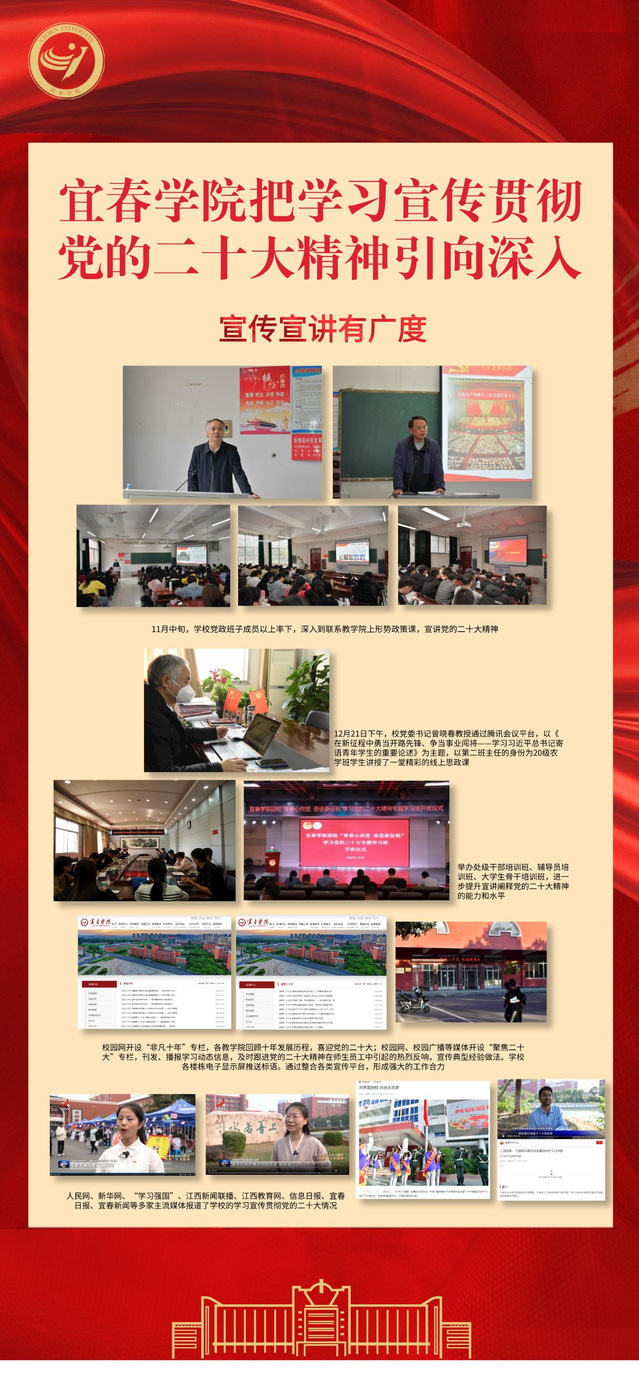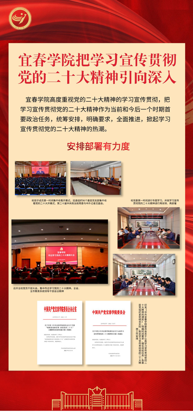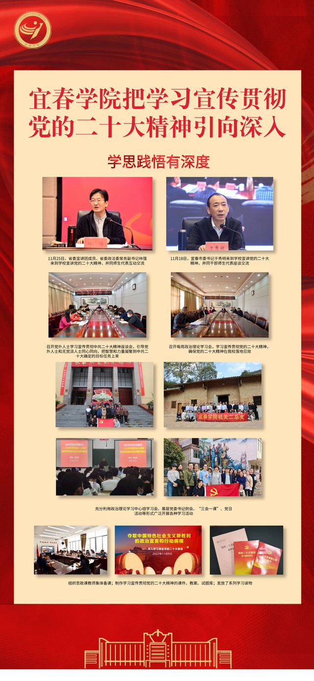 校党委召开专题党委会传达学习党的二十大精神,班子成员带头集中学报告、深入谈体会,先学一步,深学一层;充分利用政治理论学习中心组学习会、基层党委书记例会、“三会一课”、党日活动等形式广泛开展各种学习活动;召开党外人士学习宣传贯彻党的二十大精神座谈会,引导党外人士和无党派人士同心同向,把智慧和力量凝聚到党的二十大确定的目标任务上来;组织教职员工在线收看教育部党组书记、部长怀进鹏所作的关于党的二十大精神宣讲报告,收看省委教育工委组织的专题宣讲报告。11月18日,宜春市委书记于秀明来到学校宣讲党的二十大精神,并同干部师生代表座谈交流。11月25日,省委宣讲团成员、省委政法委常务副书记林强来到学校宣讲党的二十大精神,并同师生代表互动交流。