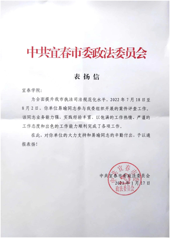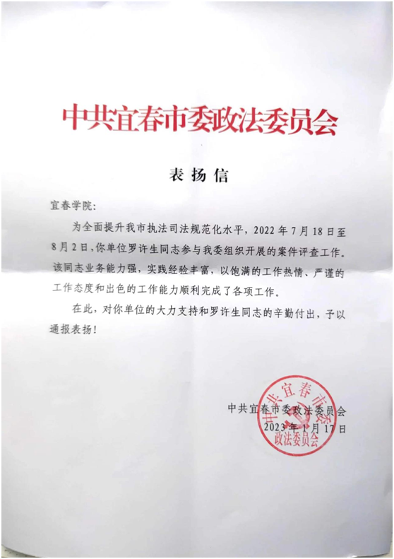 近日,中共宜春市委政法委向beat365官网发来表扬信,对beat365官网在上述案件评查工作中所给予的支持以及beat365官方网站政法学院罗许生老师、易瑜老师的辛勤付出,予以通报表扬。信中指出,beat365官网政法学院罗许生、易瑜同志业务能力强,实践经验丰富,以饱满的工作热情、严谨的工作态度和出色的工作能力顺利完成了各项工作。