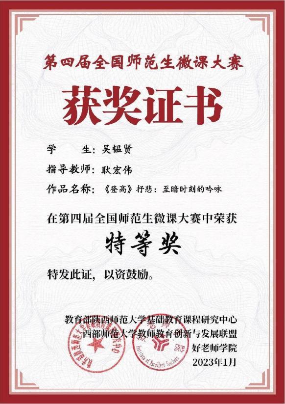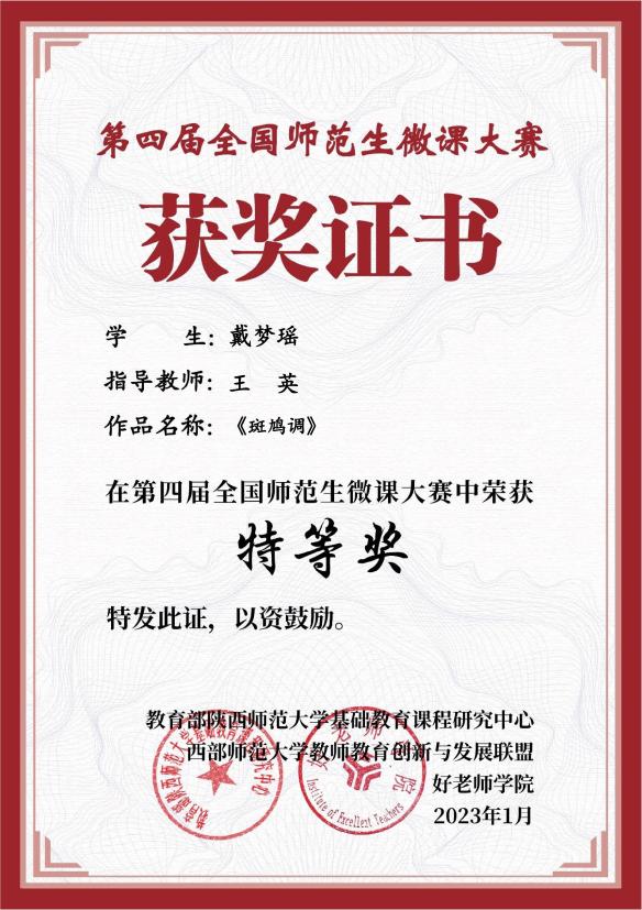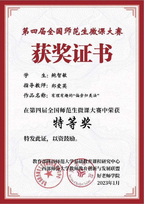 本站讯(特约通讯员 卢怡)近日,从全国师范生微课大赛官方平台传来喜讯,beat365官网共有12件微课作品在第四届全国师范生微课大赛中获奖,其中文学与新闻传播学院吴韫贤、吕卫卫、鲍志敏和音乐舞蹈学院戴梦瑶等同学荣获特等奖,其余作品分别荣获一等奖2件,二等奖6件,beat365官网王英、欧阳椿陶、耿宏伟和郑爱英等教师获评微课大赛“优秀指导老师”。在师范教育学院精心组织下,beat365官网再次荣获了“优秀组织院校”奖。