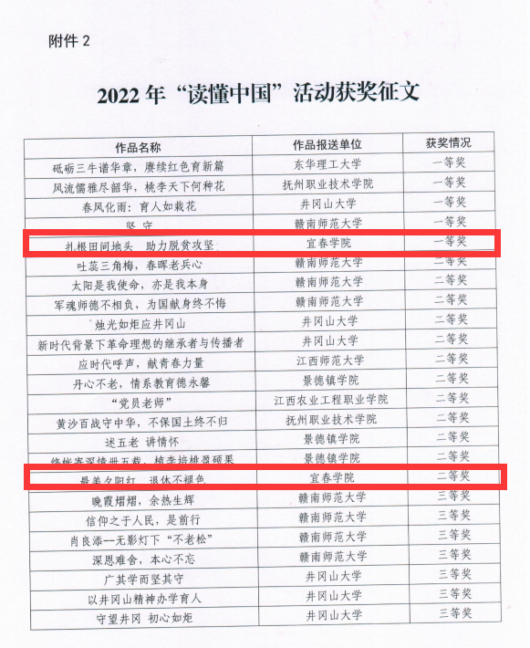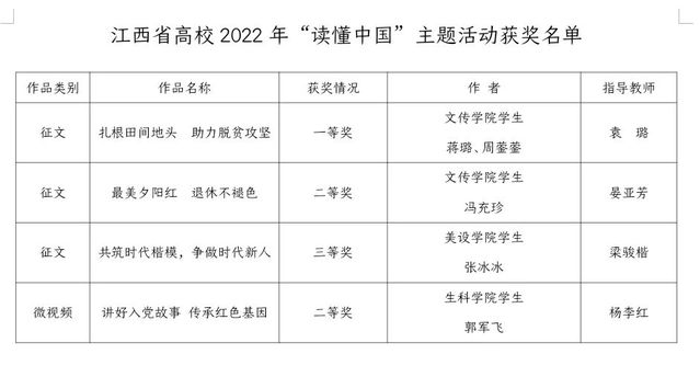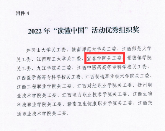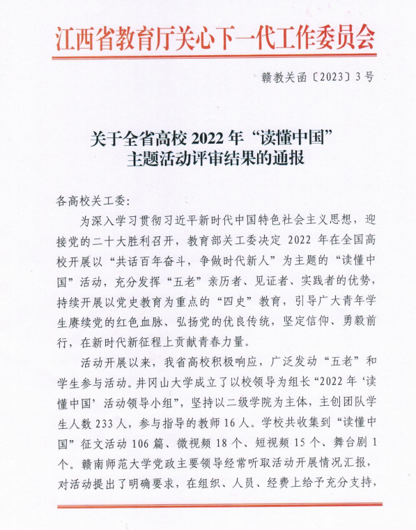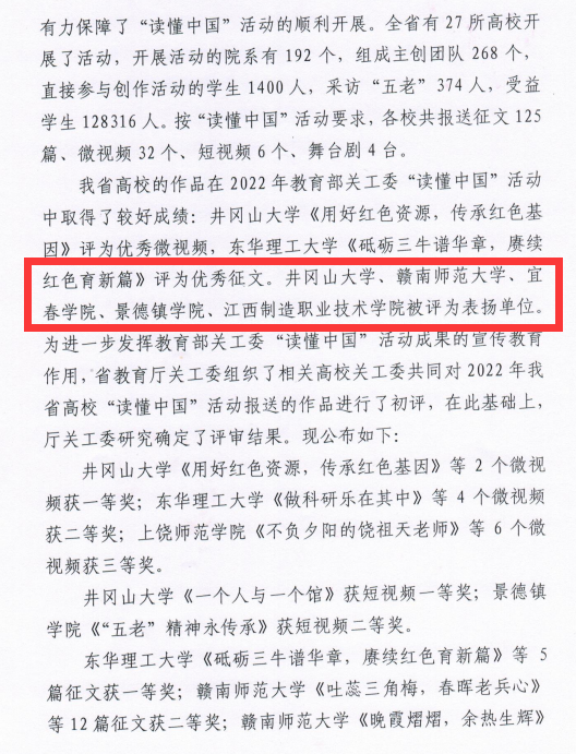 (本站讯 离退休处供稿)近日,省教育厅关工委印发《关于全省高校2022年“读懂中国”主题活动评审结果的通报》,在2022年“读懂中国”活动中,beat365官网获教育部关工委表扬单位,校关工委获得“2022读懂中国”优秀组织奖。其中,beat365官网选送的作品在征文、微视频项目类别中获得一等奖1项、二等奖2项、三等奖1项。