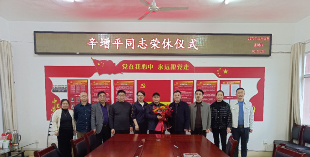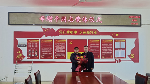 仪式最后,罗政同志为退休干部辛增平发放退休证,献上慰问金和鲜花。全体参加人员一起合影留念。