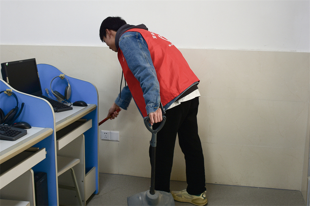 活动中,志愿者们分组对该院的公共机房进行清理维护。清理范围主要包括桌面、电脑显示器、主机表面浮灰、各机房主过道的清洁等。志愿者们齐心协力,对机房里的每个角落进行了清洁,为同学们创造了一个舒适卫生的学习环境,进一步营造良好的学习氛围。