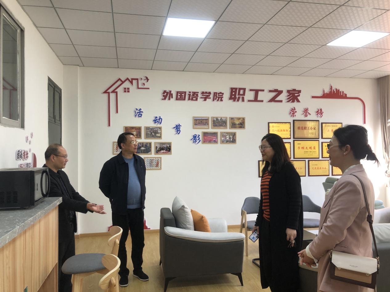 本站讯(校工会 供稿)3月13日下午,校党委副书记胡国瑞到外国语学院、物理科学与工程技术学院调研指导“职工小家”的建设工作,校工会副主席姜敏陪同调研。