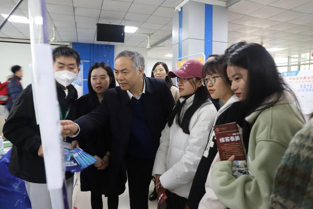 校党委书记、校长曾晓春,副校长梅光泉到会指导,与参会用人单位进行了交流,详细了解了用人单位的招聘情况,并与参会毕业生进行了亲切交谈,询问了他们的求职意向、就业意愿以及就业过程中遇到的问题和困难。曾晓春指出“学校将持续优化就业咨询服务,创新工作载体和抓手。院校两级将努力拓宽就业市场,帮助2023届毕业生实现更高质量、更加充分的就业。”