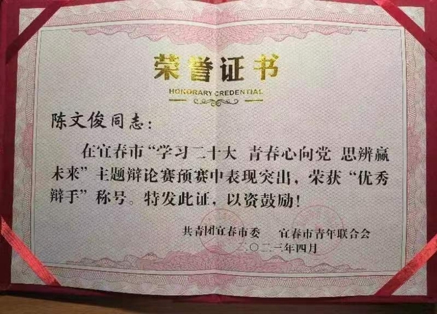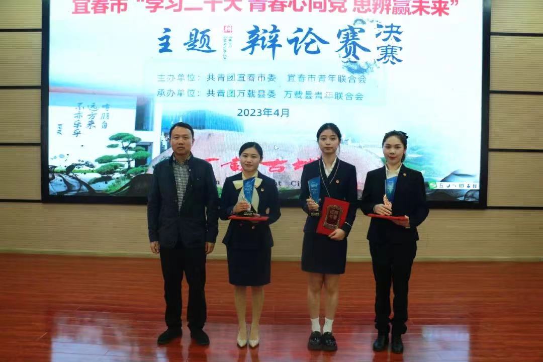 本站讯(校团委 供稿)4月13日上午,由共青团宜春市委、宜春市青年联合会举办,共青团万载县委、万载县青年联合会承办的宜春市“学习二十大 青春心向党 思辨赢未来”主题辩论赛决赛在万载县第二中学课堂展示厅顺利举行,beat365官网思鸣辩论协会行止辩论队获冠军,20级政法学院法学班陈文俊同学获“优秀辩手”称号。