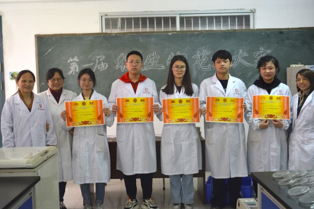 经过10天的耐心培养和细心呵护,同学们将所准备好的微生物培养皿交于指导老师进行评审,老师们通过培养皿中的绘图以及同学们对作品的讲解介绍进行评判,最终评选出一等奖1项、二等奖2项、三等奖4项,个人最佳创意奖5项。由谢冰幸,李星辰,汪洁组成的小组获得一等奖,谢冰幸、罗坤、李星辰、杨采璐、任昕获得个人最佳创意奖。之后,老师们为获奖同学颁发了奖状并合影留念。至此,大赛圆满落下帷幕。