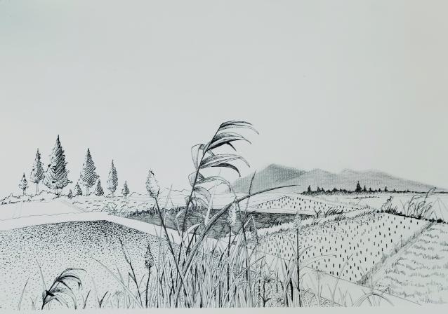 “在落日的余晖里,远远的山坡上,星罗棋布的老式房屋散发出昏黄的灯光,袅袅的炊烟弥漫开来……这样平淡如水的场景不仅是无数人儿时的记忆,也是中国千百个乡村的缩影。”这是芮典进行艺术考察时印象深刻的一幕,祖国的大好河山和生活的点滴碎片都是她进行创作灵感不竭的源泉。“版画更像是‘讲故事’,通过一些照片和记忆绘画出来,最关键的就是细节的刻画,精细处尤其费眼里,更需要付出极大的耐心、细心。”