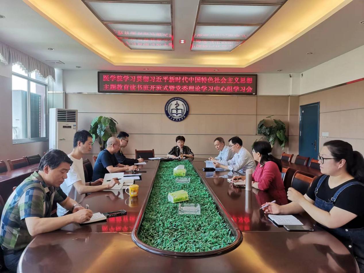 本站讯(医学院 供稿)5月4日下午,医学院在院会议室举行学习贯彻习近平新时代中国特色社会主义思想主题教育读书班开班式暨党委理论学习中心组(扩大)学习会。医学院党委成员、科级干部、各党支部书记参加会议。会议由院党委副书记刘斌主持。