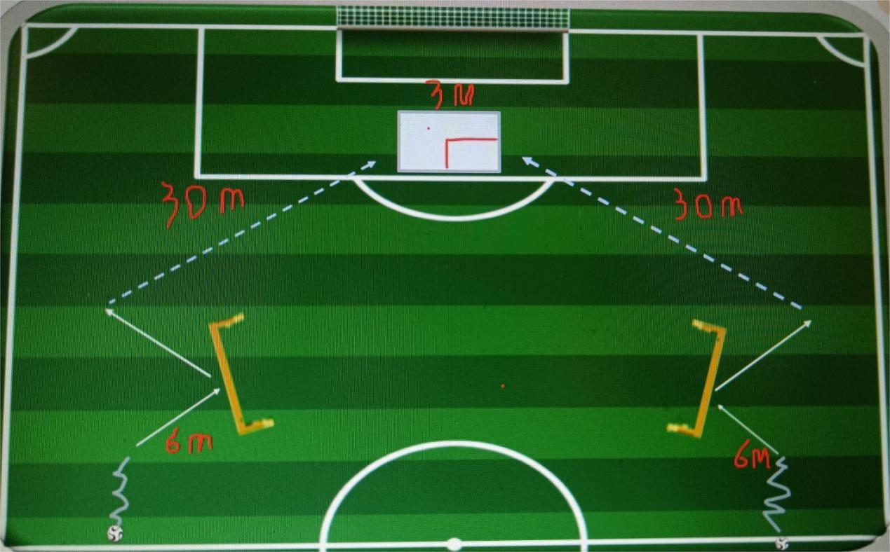 考试方法:场区为11人制半场。考生从中线起点向边路进行运球,到达第一传球点6米短传到挡板,经挡板反弹回来再30米长传到点球点假人处。每人左右各2次机会。各有一次传入3*3的正方形区域满分,包括踢中假人。左右脚各10分,没踢进区域不得分。