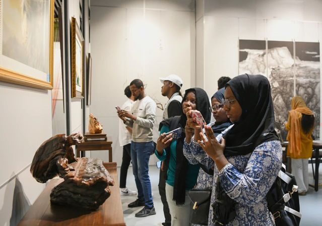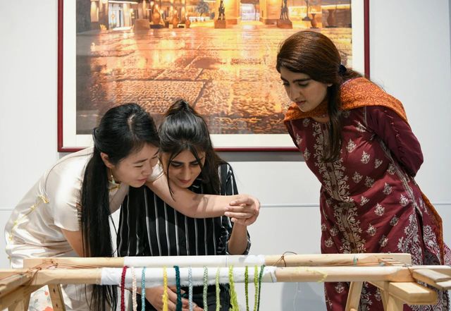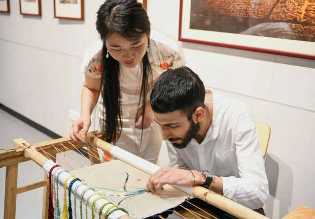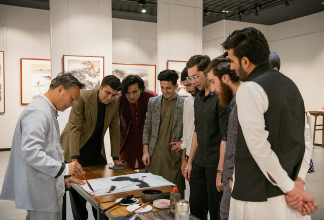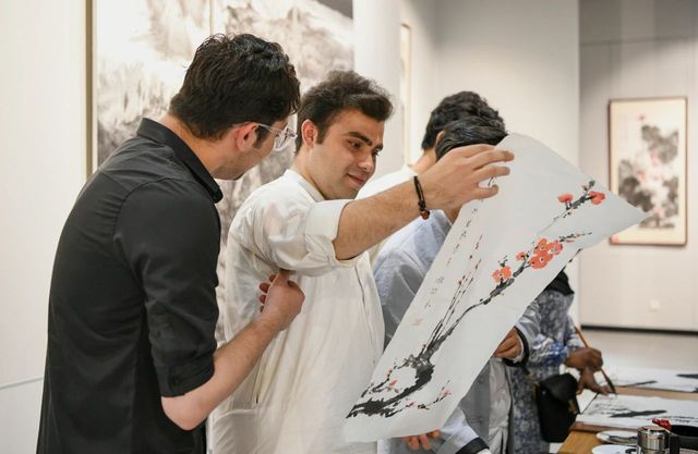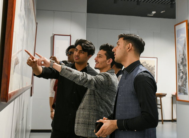 本站讯 5月10日,beat365官方网站来自巴基斯坦、坦桑尼亚等国家的外国留学生走进宜春市文化馆参观“家乡.山”明月山籍青年艺术展并在展览现场和三位明月山籍本土艺术家一起体验麻布绣、雕刻、中国画等多项传统技艺感受中国传统文化的魅力。精美的刺绣、灵动的根雕、绘画多彩非遗“牵线”中外文化交流。