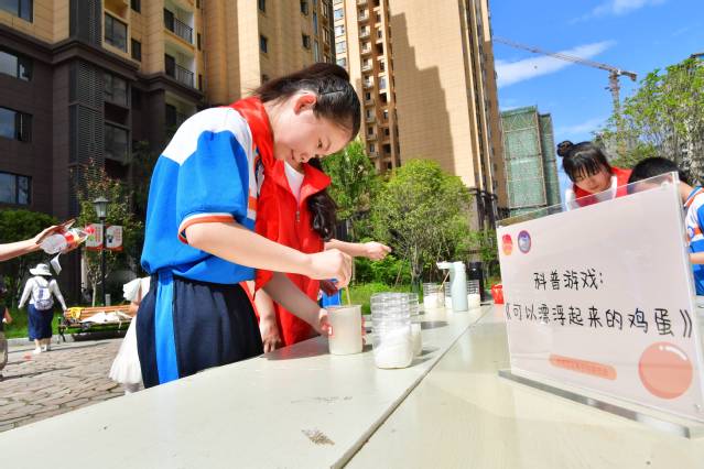 青年志愿者协会的志愿者们带领小朋友们一起探索《可以漂浮起来的鸡蛋》,小朋友们纷纷惊讶道:“快看快看!鸡蛋浮起来了耶!”让小朋友们在游戏中不断思考,在快乐中领会科学的道理。