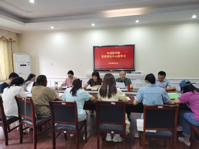 本站讯(外国语学院 供稿)6月5日上午,外国语学院在人文楼S208会议室召开党委理论中心组学习(扩大)会。会议由该院党委书记伍忠主持,该院党委班子成员参会,院长高芸及其他院行政人员列席会议。