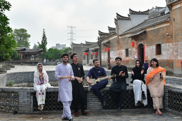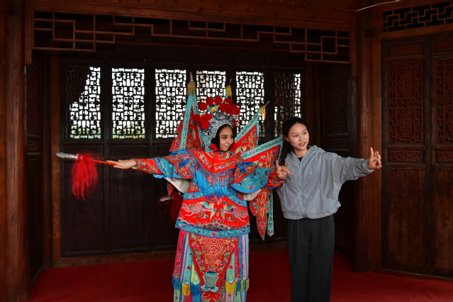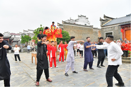 下午,留学生来到湖塘乡坑里古村,参观传统古建筑,欣赏地方特色采茶戏表演,并穿上戏服学习戏曲动作,与当地村民共享中国传统戏剧盛宴。随后,留学生们围聚在一起,认真观赏了舞狮和国家级非物质文化遗产项目——岳家狮表演,并现场拜师学艺,跟着岳家狮表演传承人熊志柱学起岳家拳动作,身临其境感受非物质文化遗产的独特魅力。最后,留学生现场弹奏了巴基斯坦传统乐器,表演了本国特色舞蹈。充满了异域风情的音乐与舞蹈赢得了当地群众的喝彩,现场氛围其乐融融,大家在文化交流中加深了友谊。
