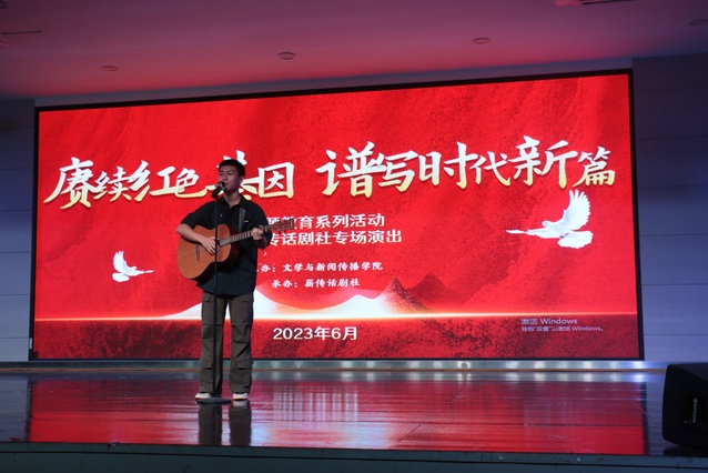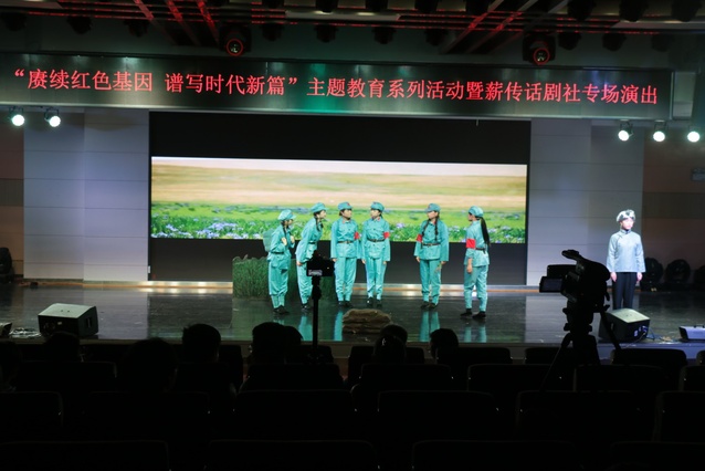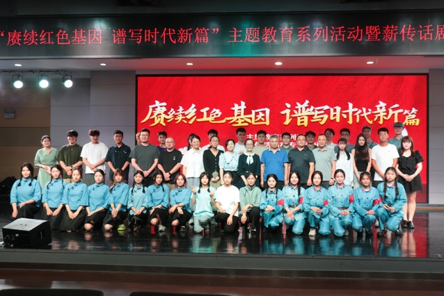 本站讯(学生记者 舒心)为深入贯彻落实党的二十大精神,推动学习贯彻习近平新时代中国特色社会主义思想主题教育走深走实,教育引导广大青年学子坚定不移听党话、跟党走,努力成长为有理想、敢担当、能吃苦、肯奋斗的新时代好青年,6月8日晚,文学与新闻传播学院“赓续红色基因,谱写时代新篇”主题教育系列活动暨薪传话剧社专场演出在青年发展中心顺利举办。该院党委书记刘建平、院长冷瑾、党委副书记黄国斌和该院师生一同观看演出。