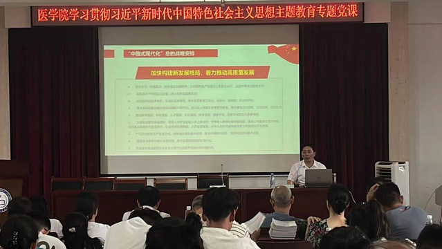 本站讯(医学院 供稿)为深入学习贯彻习近平新时代中国特色社会主义思想,推进医学院主题教育走深走实,6月14日下午,校党委委员、副校长李建军到医学院讲授《以“中国式现代化”全面推进中华民族的伟大复兴》为主题的专题党课,医学院全体教职工及部分学生党员代表参加学习。