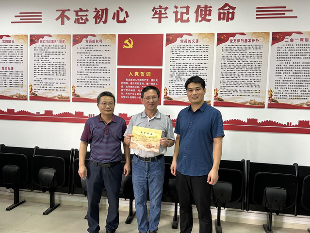 本站讯(化学与生物工程学院 供稿) 6月20日,校党委组织部相关负责人代表党组织向化学与生物工程学院退休教授黄皓同志转交了大额党费收据,并与其进行了座谈交流。化学与生物工程学院党委书记一同参加座谈。