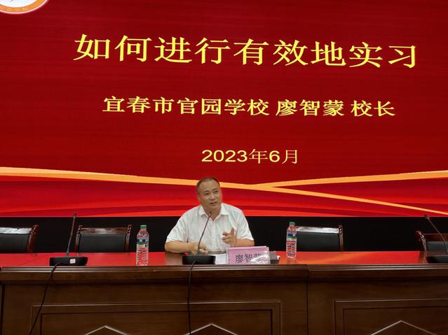 大会还请来了宜春市官园学校廖智蒙校长,为全体师范生开展了一场精彩的讲座。他从四个方面讲述了实习中应该特别关注的问题,一是实习中可能出现的问题;二是问题的应对建议,包括增强四种能力:业务能力、教学组织能力、沟通能力、反思能力,与做好四种准备:班主任准备、bc班准备、双班准备、名师准备等;三是关于备课,比如如何上好开学第一课、教课20条等;四是关于做班主任的其他事项。希望同学们能在即将到来的实习期间专业能力和职业素养有所提升。