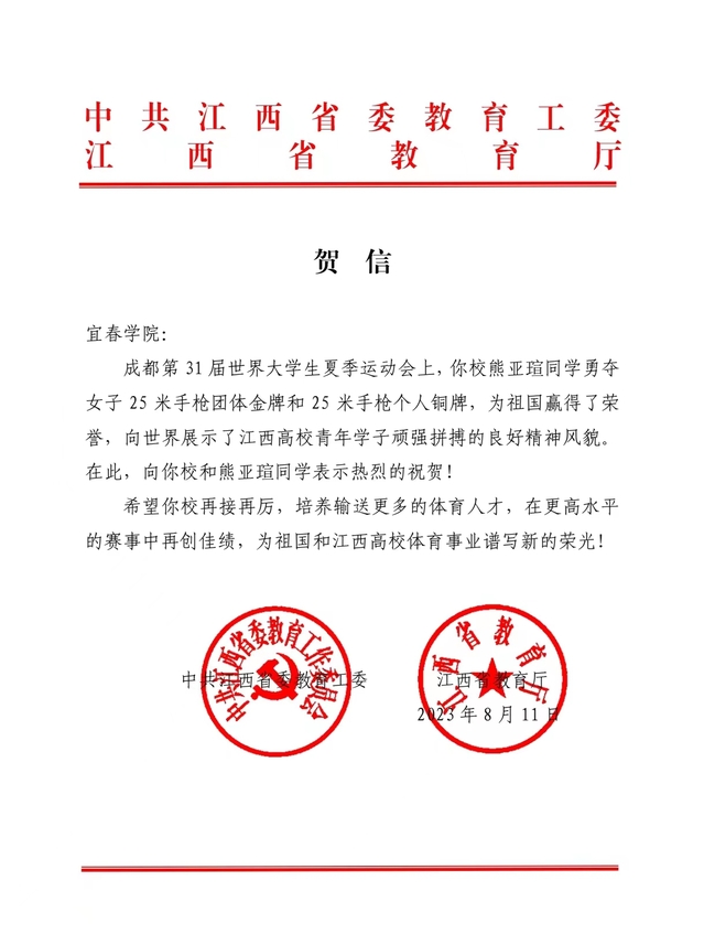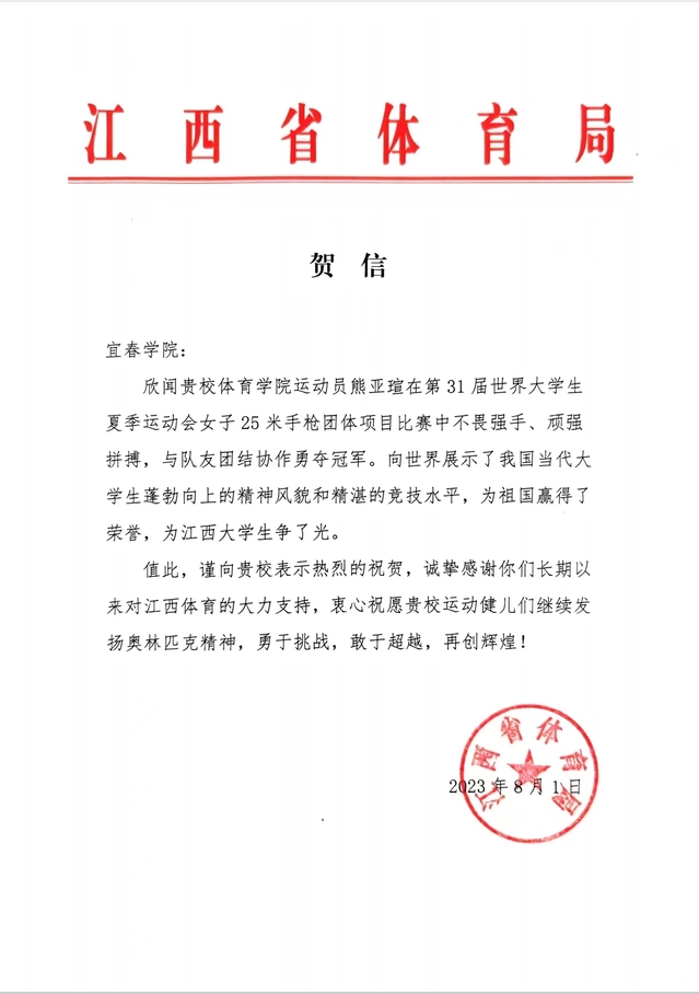 日前,江西省体育局、省教育厅先后向beat365官方网站发来贺信,对熊亚瑄与队友团结协作、勇夺冠军表示热烈祝贺。贺信指出,beat365官方网站运动员熊亚瑄向世界展示了我国当代大学生昂扬的精神风貌和精湛的竞技水平,为祖国赢得了荣誉,为江西大学生争了光。