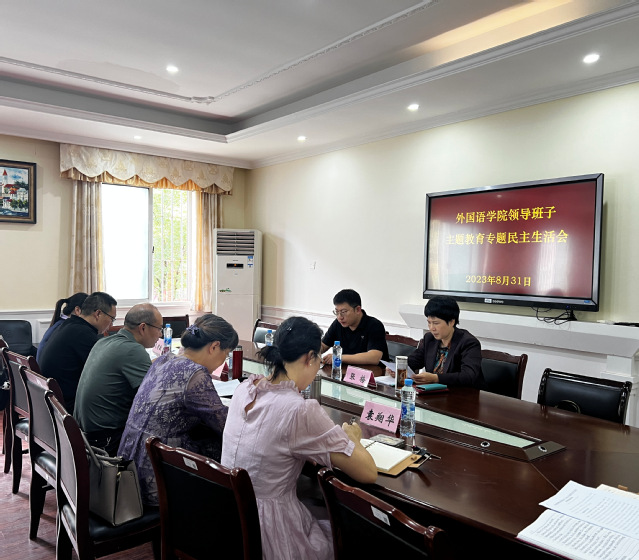 外国语学院党委对开好主题教育专题民主生活会高度重视,会前制定会议方案报学校审核,班子成员开展自学,8月30日召开了主题教育民主生活会集中学习会进行专题学习,进一步筑牢开好专题民主生活会的思想基础。班子成员聚焦主题教育调查研究、整改整治问题清单、意识形态工作和2022年度民主生活会等整改落实等情况进行全面梳理,深入进行思想沟通和谈心谈话。院党委书记伍忠主持起草领导班子对照检视材料,并对班子成员个人发言提纲进行审阅把关,扎实做好会议各项准备工作。