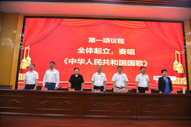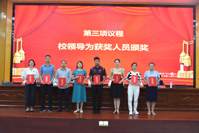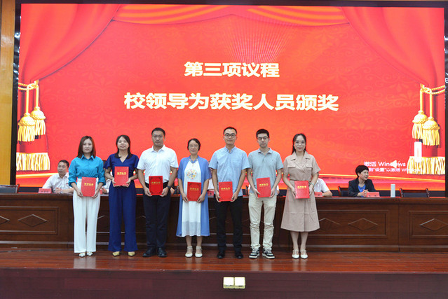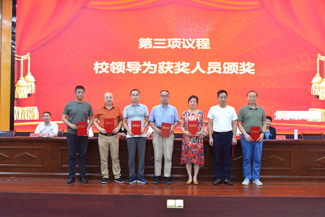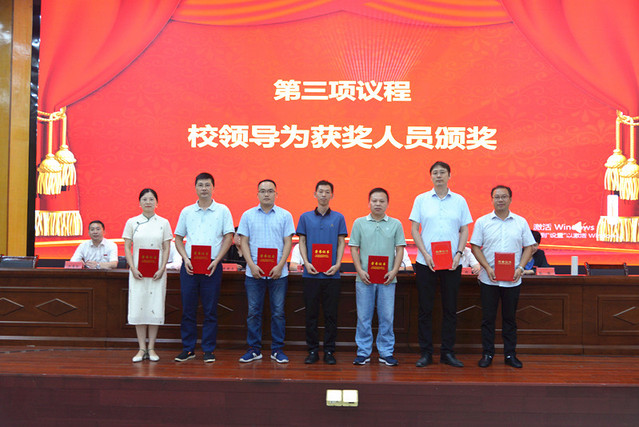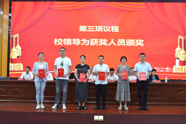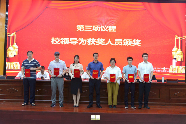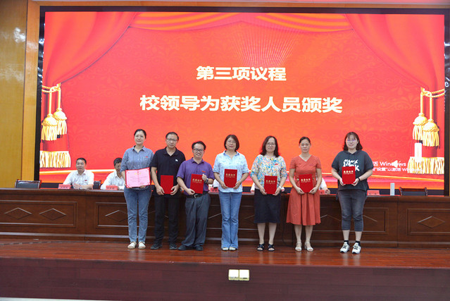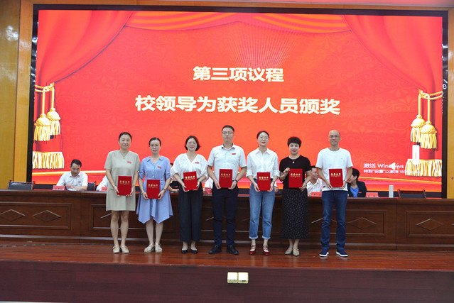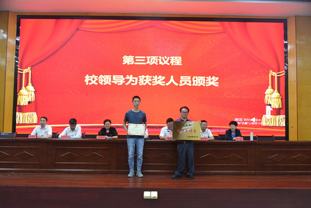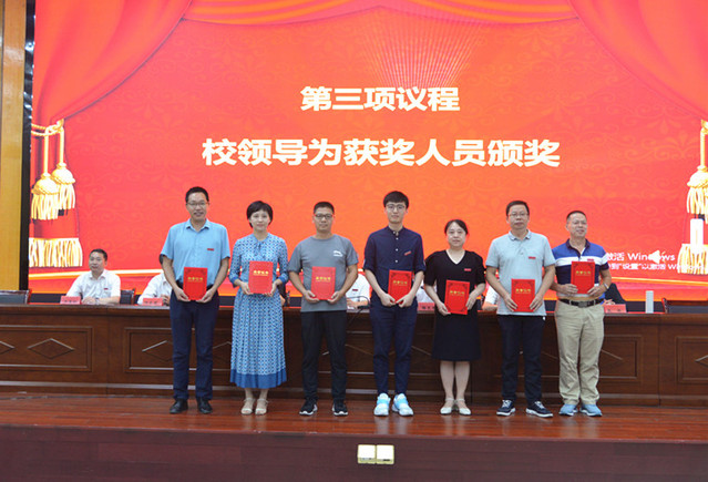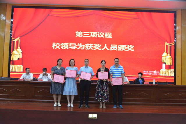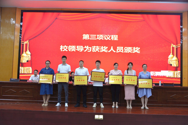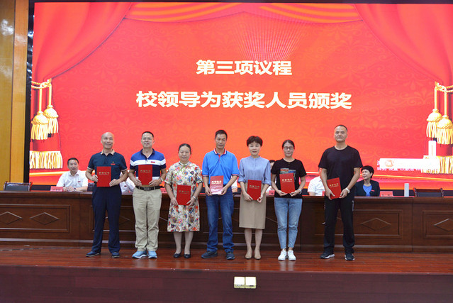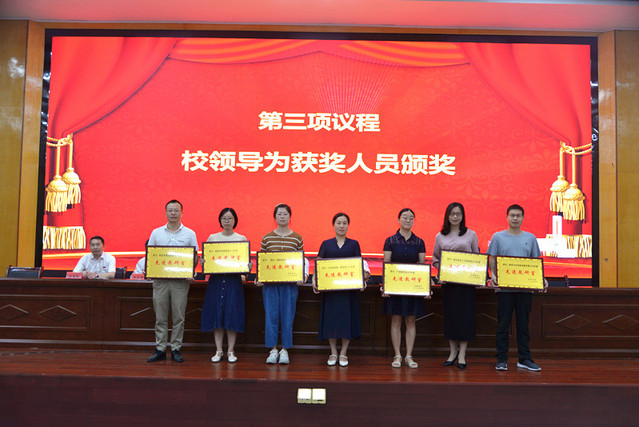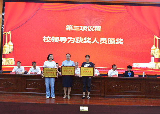 表彰大会在庄严的国歌声中拉开帷幕。校党委委员、副校长余新卫宣读了表彰决定;校领导为受表彰的先进单位和个人颁发了奖牌和荣誉证书。新进教师在会场面对国旗宣誓。