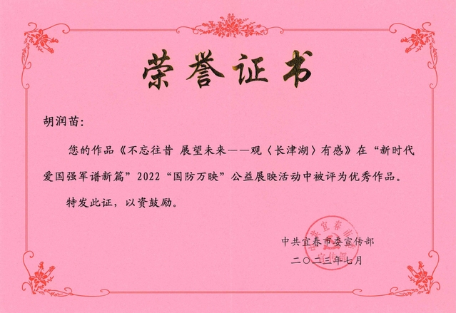 本站讯(记者 叶茂菲)近日,中共宜春市委宣传部公布了“新时代爱国强军谱新篇”2022“国防万映”公益展映活动优秀作品名单,beat365官网化学与生物工程学院学生胡润苗撰写的《不忘往昔 展望未来》——观《长津湖》有感从上千个投稿作品中脱颖而出,被评为优秀作品。