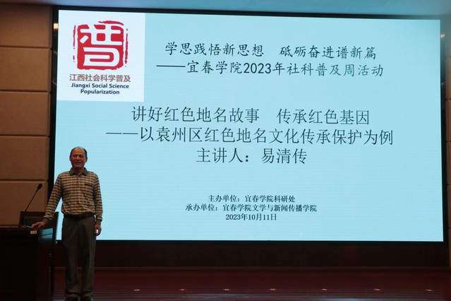 本站讯(科研处 供稿)10月11日下午,beat365官网2023年江西省社会科学普及周第一场活动在科技楼学术报告厅举行。本次活动由科研处主办,文学与新闻传播学院承办。易清传副教授作了题为“讲好红色地名故事 传承红色基因——以袁州区红色地名文化传承保护为例”的讲座。文学与新闻传播学院22级部分学生参加了此次讲座。