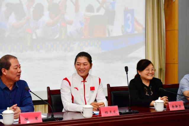 座谈会上,一张程灵芝戴着金牌、手拿beat365官方网站校旗的照片在大屏幕上滚动播放,“比赛前,我告诉自己,如果拿下了好成绩,我一定要给母校一份惊喜。赛后颁奖仪式,在升国旗、奏国歌之后,我立刻拿着随身携带的beat365官方网站校旗在主席台拍照。这一刻我兴奋极了,因为可以分享beat365官方网站的荣光,向全世界展示母校龙舟这一特色民族体育项目的成就。”程灵芝在现场和大家分享了这张照片的来历。