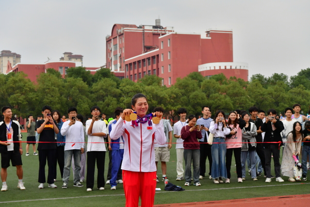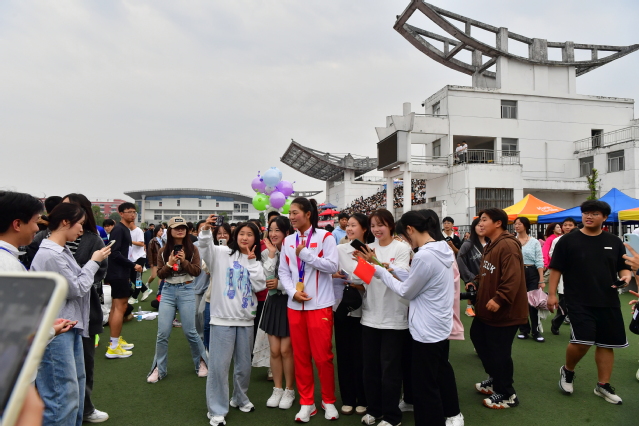 座谈会后,程灵芝前往校运会比赛场地、学校龙舟训练馆,现场和师生互动,每到一处,都受到师生的热烈欢迎。在同学们的簇拥中,程灵芝热情回应师弟师妹们的“签名”要求。大家纷纷表示,他们将带着程灵芝的故事和鼓励,投入到接下来的学习和生活中,用拼搏精神追逐梦想,实现自己的人生价值。