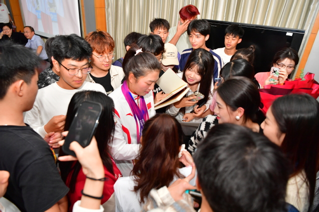 她用自己的经历,告诉学弟学妹们,冠军并非一蹴而就,没有人能随随便便成功,面对变幻莫测的未来,我们可以做到的就是把握每个机遇,在逆境中坚持到底,不言放弃。她用自己训练和比赛的经历,诠释了信念和毅力的重要性。“接下来,我将全力以赴备战巴黎奥运会,争取用最好的成绩回报我的母校!”程灵芝持之以恒刻苦训练、勇于突破、不断挑战和继往开来的奋斗精神深深地烙印在了学生的心中。